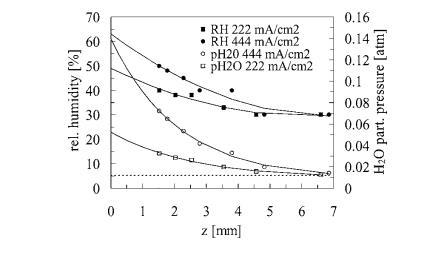 圖12顯示了在相同的電流負載循環(huán)條件(在0和333 mA/cm2之間)下測量的RH和PH2O瞬態(tài)。雖然RH信號顯示非常小的瞬態(tài)響應(yīng),但PH2O響應(yīng)在恒定電流負載下顯示出較大的變化。PH2O瞬變的初始部分可以用指數(shù)函數(shù)近似,得出時間常數(shù)TH2O~14 s。這個時間常數(shù)基本上反映了濕度傳感器的上升時間,因此初始PH2O瞬變時間尺度的精確測量未能實現(xiàn),但我們可以將其值限定在小于約14 s。隨后PH2O隨時間增加的速度要慢得多,并且是非指數(shù)性質(zhì)的。這種響應(yīng)表明陰極表面有液態(tài)水積聚,如先前所述。當(dāng)電流在t~1500 s中斷時,PH2O迅速恢復(fù)到環(huán)境條件,同樣具有約14 s的弛豫時間。(然而這次請注意,PH2O信號沒有表現(xiàn)出次要的線性分量。)另一方面,RH響應(yīng)顯示出有趣的超調(diào)行為。最可能的是,這種超調(diào)與濕度傳感器固有響應(yīng)時間的限制有關(guān)(參見濕度傳感器校準(zhǔn)部分)。為完整起見,我們注意到,這種超調(diào)也可能是由于水生產(chǎn)立即中斷與電池溫度緩慢下降之間的時間滯后造成的。由于這種滯后,陰極上方仍然溫暖的空氣將經(jīng)歷RH的突然下降,隨著電池(和周圍空氣)冷卻下來,RH presumably會恢復(fù)。