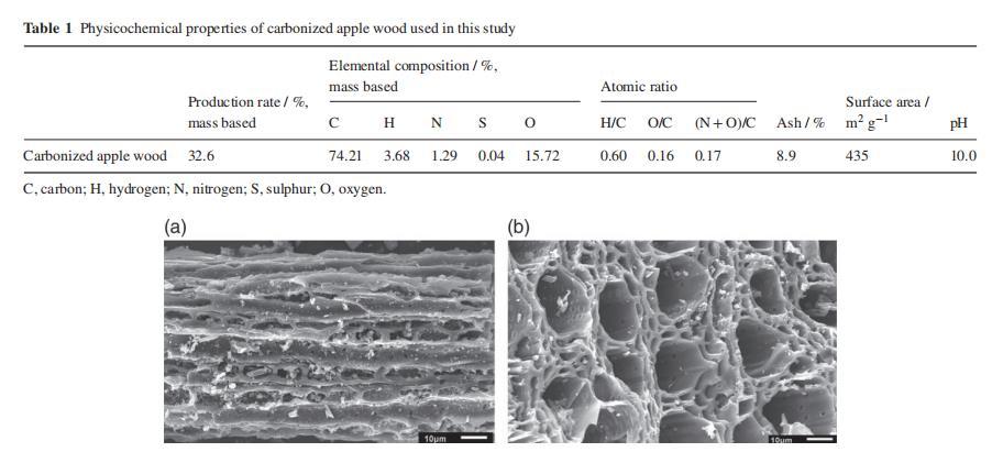 土壤采集自中國山東省泰安市(北緯36°10′,東經117°07′)一處耕地的0-20厘米深度。該土壤為砂質粘壤土(粘土12.8%,粉砂25.3%,砂61.8%),根據Shi等人的分類屬于褐土,Leptic Luvisol。土壤pH為7.1,含有總有機碳7.20 g kg?1,有效磷32.9 mg kg?1,有效氮26.6 mg kg?1,有效鉀102.5 mg kg?1,有機質12.41 g kg?1。碳化蘋果木是通過在N?環境中,于高溫碳化爐(Dotrust DC-B,中國北京)中700°C處理磨碎的冬季修剪蘋果枝條2小時制備的,定義為CAW。表1呈現了CAW的元素組成。CAW的掃描電子顯微鏡分析顯示存在獨特的排列有序的蜂窩狀孔隙,這可能代表了原料生物毛細管結構的碳質骨架。