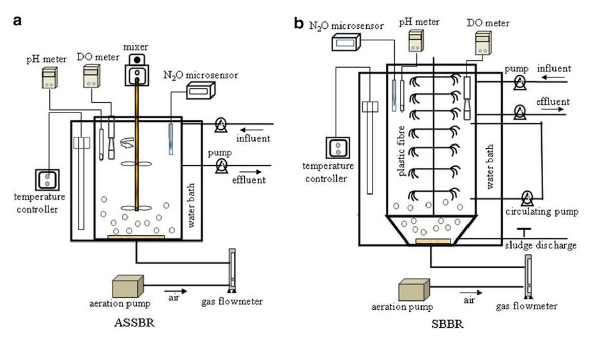 圖1。實(shí)驗(yàn)系統(tǒng)的示意圖說明:(a)為ASSBR,(b)為SBBR。ASSBR,活性污泥序批式反應(yīng)器;SBBR,序批式生物膜反應(yīng)器。