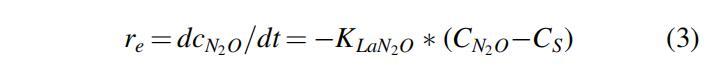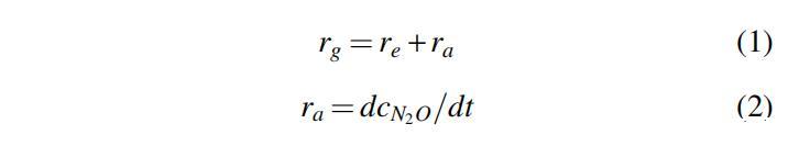 N2O生成[rg;mg N/(L$s);等式(1)]、累積[ra;mg N/(L$s);等式(2)]和排放[re;mg N/(L$s);等式(3)]率是使用基于在線N2O液體濃度測量的余額計(jì)算的(J.Gabarro等人,2014年)。