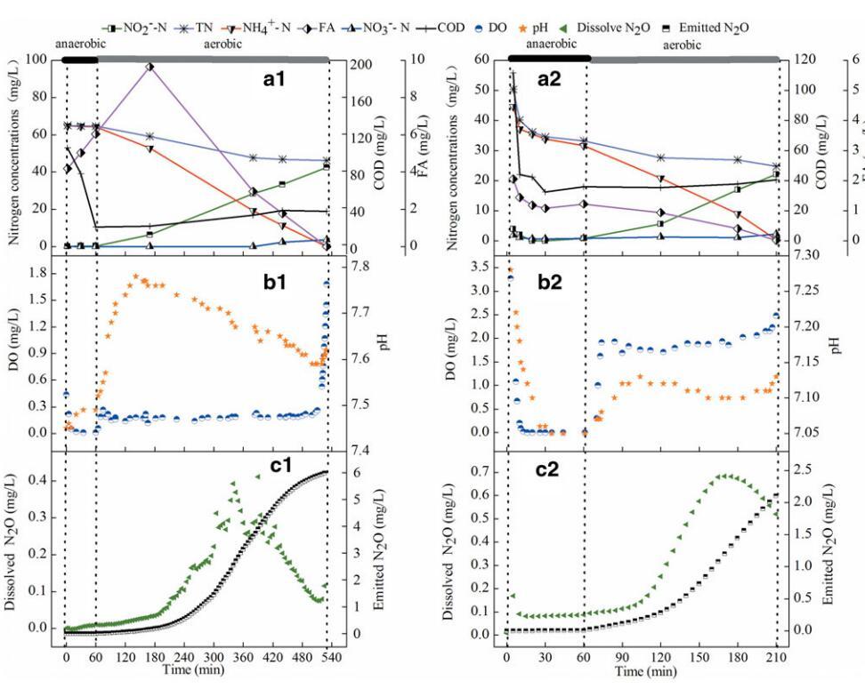 圖2。在兩個(gè)SBR循環(huán)中,低氨氮(120 mg/L)的氮化合物和控制參數(shù)的典型變化:(a1、b1、c1)是ASSBR中的COD、氮化合物、pH、DO和N2O;(a2、b2、c2)是SBBR中的COD、N-化合物、pH、DO和N2O。溶解氧;FA,游離氨。