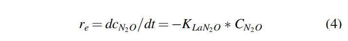 式中,KLaN2O是N2O從水到空氣的體積傳質(zhì)系數(shù)(s-1);CN2O為液體中的N2O濃度(mg N/L);CS為與空氣平衡的液體中的N2O飽和濃度(mg N/L;假設(shè)為0);t是時(shí)間(秒)。方程式(3)改寫為: