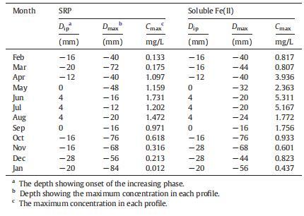 為了更好地描述SRP和可溶性Fe(II)剖面的特征,表3總結了增加階段(Dip)開始的深度、每個剖面中的最大濃度(Cmax)以及出現最大濃度(Dmax)的深度。對于SRP,傾角從?3月為20毫米,6月至8月為4毫米,隨后下降到更深的水平?12月28毫米。Dmax也變得較淺?3月至3月為72毫米?7月為12毫米,隨后深度下降至?2017年1月為84毫米。Cmax從2月的0.133 mg/L增加到6月的1.73 mg/L,然后在2017年1月下降到0.01 mg/L。可溶性Fe(II)的傾角、Dmax和Cmax的變化與SRP的變化相似,在6月至8月期間,最淺的傾角為4mm,最淺的Dmax為4mm?9月為16毫米,6月最大Cmax為5.31毫克/升。
