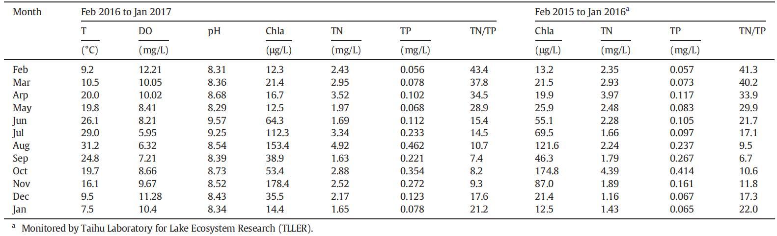 Chla濃度超過20和40μg/L被定義為水華,尤其是太湖有害水華(Xu等人,2015年)。在這項研究中,月平均Chla為56μg/L,反映出梅梁灣的赤潮造成了非常嚴重的危害(表1)。從2月到5月,葉綠素濃度保持在較低水平,只有3月的值超過20μg/L,這段時間被視為開花前階段。從6月到8月,Chla濃度急劇增加,濃度范圍極高(45–153μg/L),即確定為開花期。這段時間之后,9月份的葉綠素濃度急劇下降,然后在11月份迅速上升。在太湖和其他湖泊中觀察到了這種現象(Giles等人,2016年),這表明在9月出現了水華崩潰,然后在11月出現了晚季水華。
