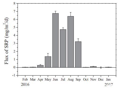 圖7。2016年2月至2017年1月太湖梅梁灣沉積物-水界面SRP擴散通量。