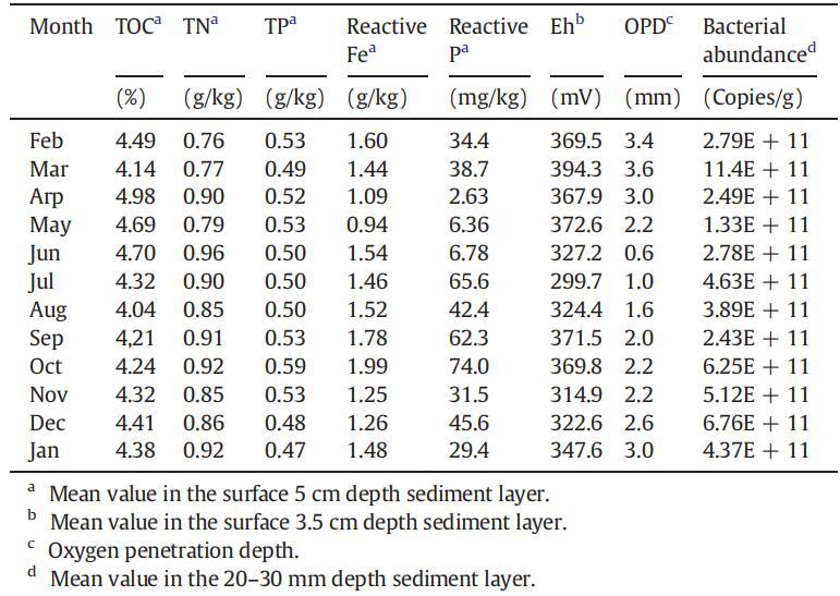 表2列出了基本的沉積物質量特征。在表層沉積物中,TOC、TN和TP的濃度變化不大。在大多數采樣時間,活性鐵和磷的濃度顯示出相似的分布,從4月到5月,鐵的濃度和從4月到6月,P的濃度都非常低(圖2)。細菌豐度的濃度范圍為1.33E+11到11.4E+11拷貝,3月份的值明顯高于所有其他月份。OPD從6月的0.6毫米到2月的3.4毫米不等,6月到8月的OPD值相對較低(0.6到1.6毫米)(圖3)。Eh值隨沉積深度的增加而降低(圖4),3.5 cm表層的所有平均值均為N300 mv(表2)。