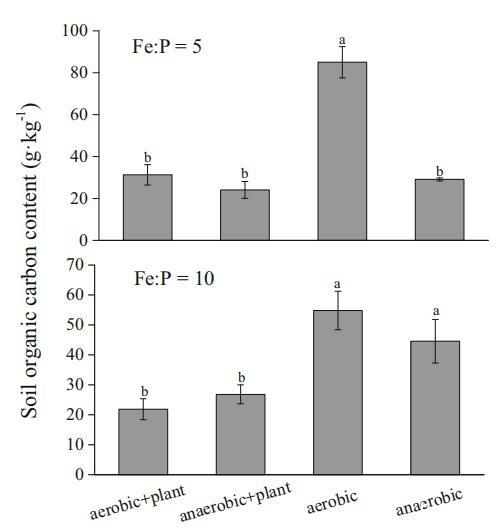 圖4兩種鐵磷比下四種處理(好氧+植物、厭氧+植物、好氧和厭氧)的土壤有機碳含量