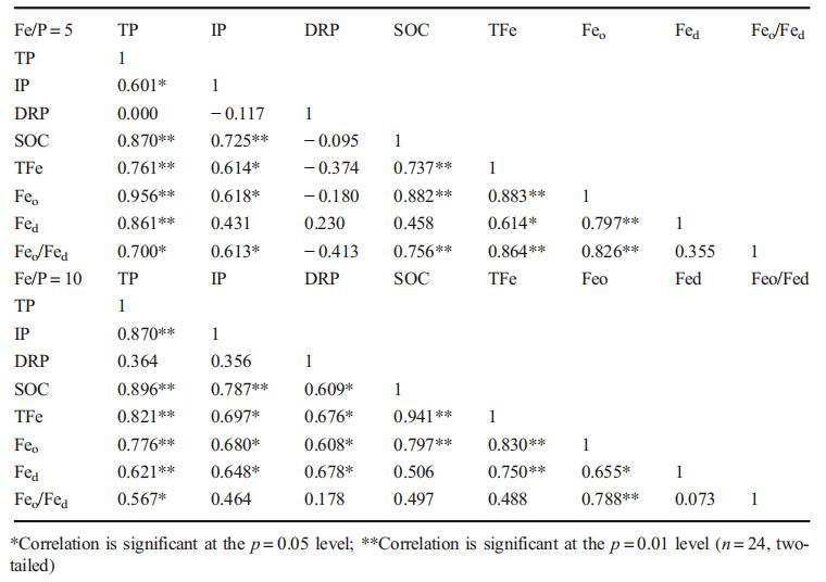對不同鐵磷比下的TFe、Feo、Fed、P形態(tài)和SOC進行了相關(guān)分析(表4)。鐵磷比為5時,F(xiàn)eo、鐵活性(Feo/Fed)和SOC之間存在顯著相關(guān)性(p<0.05),但在鐵磷比為10時,F(xiàn)eo/Fed和SOC之間沒有相關(guān)性。因此,有機碳(即有機質(zhì))的增加會促進Feo的增加,但不一定會增強土壤的氧化鐵活性。