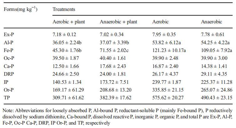 表2鐵磷比為5時四種處理的不同磷形態(tài)。數(shù)值表示為平均值±標(biāo)準(zhǔn)誤差。同一列中具有相同小寫字母的平均數(shù)在p<0.05時顯著不同(反之亦然)