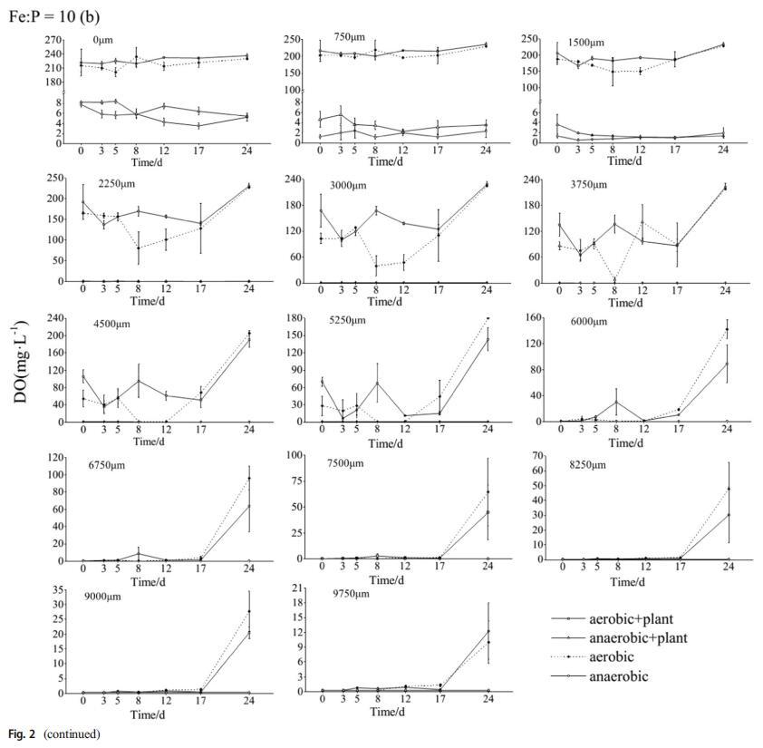 3.2不同鐵磷比下土壤元素的積累特征DO濃度分為三類:0-1500、2250-5250和≥6000,不考慮Fe/P(圖2a,b)。當(dāng)深度小于1500μm時,所有四種處理的DO濃度都是穩(wěn)定的。由于氧氣的引入,有氧組保持較高的DO濃度,其他兩組在4 mg L左右波動?1因為氮氣的引入。在2250和5250μm之間的深度,溶解氧濃度隨波動而增加。深度大于6000μm時,溶解氧濃度達到極限值(0.3 mg L?1),但在有氧條件下第12天后增加,表明深層土壤中的DO濃度降低,但隨著時間的推移迅速增加。土壤Eh值在兩種不同的鐵磷比之間差異很大。鐵磷比為5時,不同處理的土壤Eh值不同(圖2c)。好氧+植物處理的土壤Eh值向上波動,而厭氧+植物處理的土壤Eh值降至最低(第5天),然后緩慢上升,而對照處理的土壤Eh值則波動并下降。在鐵磷比為10的情況下,土壤Eh值通常先降低后升高(圖2d)。