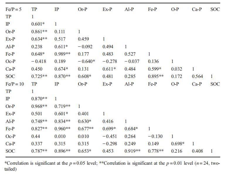 表5不同鐵磷比下磷形態(tài)與土壤有機碳的相關(guān)性
