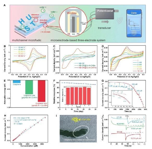 圖1.NB-GF Co-N-CNTAs微電極制備示意圖(步驟i:用離子液體(IL)浴將氧化石墨烯納米片(GO NSs)紡成氧化石墨烯纖維(GOF);步驟ii:ZIF-67-NSs在GOF上生長;步驟iii:熱解),通過集成電化學傳感器的自制多通道微流控芯片,以NB-GF Co-N-CNTAs為工作電極,檢測人類結腸細胞、神經母細胞瘤細胞以及微量生物液體中的生物分子誘導信號。