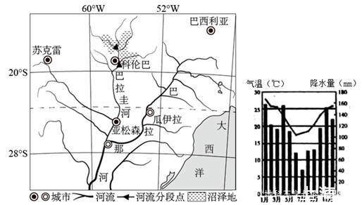 巴拉圭河是南美洲第五大河流,是巴拉那河的主要支流。科倫巴以上為中、上游,以下到與巴拉那河交匯處為下游。巴拉圭河上游位于起伏的巴西高原,中下游均位于低洼的巴拉圭平原,流域內(nèi)地表多為黏重的土壤。巴拉圭河中上游沿岸沼澤濕地為世界上最大的濕地,面積季節(jié)變化明顯,生物資源豐富。近年來,隨著人類過度占用資源,濕地被大量改造開墾,保護(hù)濕地成為迫在眉睫的問題。下圖為巴拉那—巴拉圭河流城圖和科倫巴附近氣候統(tǒng)計(jì)圖。