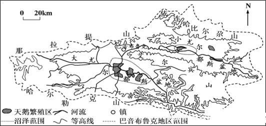 巴音布魯克濕地發(fā)育于天山山脈中部大、小尤爾都斯盆地中。盆地內(nèi)河流蜿蜒,流向區(qū)外。冬季嚴(yán)寒,年平均氣溫-4.7℃。巴音布魯克濕地內(nèi)有國家級(jí)天鵝自然保護(hù)區(qū),棲息著大量的野生天鵝。濕地周圍草場廣闊,是傳統(tǒng)的畜牧業(yè)區(qū)。20世紀(jì)中后期,出現(xiàn)過牧現(xiàn)象。同時(shí),每年都有大量的畜群進(jìn)入自然保護(hù)區(qū),嚴(yán)重干擾了天鵝的生存與繁衍。下圖為巴音布魯克地區(qū)示意圖。