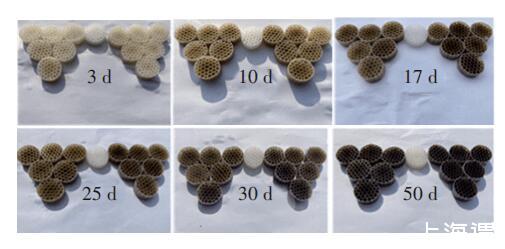 研究期間,一、二級MBBR區(qū)懸浮載體的掛膜情況如圖5所示(左側為一級,右側為二級)。懸浮載體投加3d后即出現明顯的生物膜附著且整體呈現黃棕色;10d后,整個載體掛膜已基本均勻,顏色進一步加深;17 d后,生物膜顏色進一步加深,開始從黃棕色向黃褐色轉變;30d后,生物膜呈現深褐色;50d后,生物膜呈現深褐色且致密。同時期內一、二級MBBR區(qū)的懸浮載體生物膜雖然顏色一致,但掛膜效果存在差異。