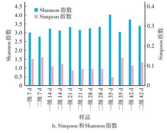 以Simpson和Shannon指數表征樣品中微生物的α多樣性。Simpson指數值越大,說明物種分布越不均勻,群落多樣性越低;Shannon指數與之相反,其值越高表明群落多樣性越高。如圖9(b)所示,前21 d生物膜的Shannon指數逐漸升高,而Simpson指數則相反;而除第28天外,其他時間一級生物膜的Shannon指數均高于同期二級生物膜,Simpson指數則相反。結合物種豐富度分析結果可知,在前21d,在一、二級生物膜物種豐富度較為穩(wěn)定的基礎上,物種分布均勻程度逐漸上升。與硝化負荷及生物量分析結果相對應,在啟動初期,生物膜中優(yōu)先富集硝化菌群,而其他菌群雖然同樣富集于生物膜中,但整體分布并不均勻,隨著系統的運行,生物膜的物種分布均勻性逐漸升高,也反映了其他菌群相對豐度的提升,進而導致生物量升高。而一級生物膜在物種豐富度較高的同時,物種分布均勻程度同樣高于二級生物膜,進而導致其物種多樣性更高。