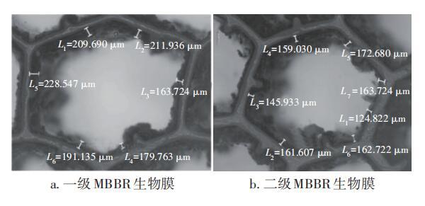 為了更準確地表征懸浮載體的硝化能力,投加懸浮載體后每7d取一、二級懸浮載體進行硝化小試,并核算硝化負荷,同步測定生物膜的生物量與厚度。硝化小試及生物量測定結果如圖6所示。懸浮載體掛膜7d后,一、二級的硝化負荷分別為0.111、0.075kg/(m3·d);在后續(xù)的7d迅速升高至0.328、0.189kg/(m3·d),此后分別穩(wěn)定在(0.32±0.008)、(0.21±0.010)kg/(m3·d),一級硝化負荷是二級硝化負荷的1.5倍左右,且均高于項目實際運行中核算的硝化負荷。由于小試的進水氨氮濃度較實際工程中的要高,因此懸浮載體表現出更高的硝化負荷,這與硝化負荷受進水基質濃度影響的結果相符。同時,也說明懸浮載體生物膜存在負荷余量,這為MBBR良好的抗水質沖擊性能奠定了生物學基礎。