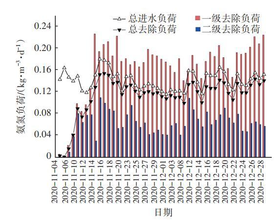 根據一、二級MBBR池進出水水質核算其實際的硝化負荷,結果如圖3所示。懸浮載體投加后的2d內,兩級MBBR區(qū)的硝化負荷(以N計,下同)均低于0.01kg/(m3·d),系統的總硝化負荷不足0.005kg/(m3·d);隨著懸浮載體掛膜效果的改善,兩級MBBR區(qū)的硝化負荷呈現快速上升趨勢,并于懸浮載體投加后的第10天分別達到了0.226、0.031kg/(m3·d),總硝化負荷為0.129kg/(m3·d);此后,一、二級MBBR區(qū)的硝化負荷分別為(0.182±0.026)、(0.066±0.020)kg/(m3·d),總硝化負荷達到了(0.124±0.017)kg/(m3·d),整體運行較為穩(wěn)定。