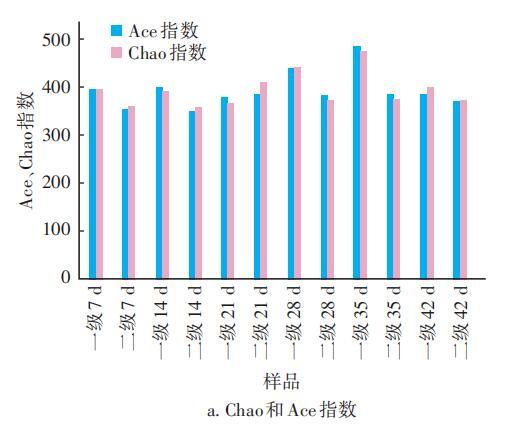 以Chao和Ace指數表征樣品物種的豐富度,指數值越大,說明該樣本物種數越多。如圖9(a)所示,整個研究階段,生物膜的Chao和Ace指數均無明顯變化趨勢,但除第21天外,其他時間一級生物膜的Chao和Ace指數均高于同期二級生物膜。可見,系統在啟動初期生物膜的物種豐富度就達到了較高水平,但受進水負荷的影響,一級生物膜優(yōu)先發(fā)揮污染物去除作用,致使其物種豐富度高于二級生物膜。