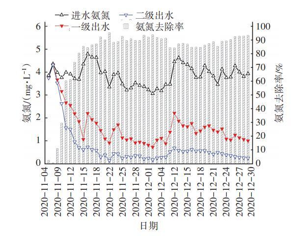 系統采用原水啟動,于2020年11月5日完成懸浮載體的投加,以一期工程(130×104m3/d)為研究對象,系統運行至12月21日時,其間日處理水量均值為(135.89±9.06)×104m3/d,其中處理水量超過設計值的天數為34d,占比超過70%,最大日處理水量達到了149×104m3/d。實際運行的氣水比為1.0~1.7,MBBR區(qū)水溫維持在18~24℃;一、二級MBBR區(qū)溶解氧自啟動開始至出水水質達標,分別由8.5、9.3mg/L降至5.6、7.6mg/L,并在后續(xù)穩(wěn)定運行期維持在(5.30±0.68)mg/L和(8.07±0.79)mg/L。