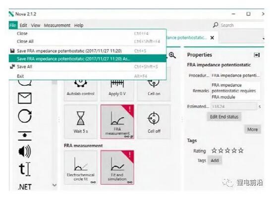 工步3:測試完畢后,單擊File選項卡,單擊Save FRA impedance potentiostatic as選項,選擇保存位置,單擊保存(save);重復測試,如測試完畢,先關閉測試軟件,再關閉放大器電源,最后關閉工作站電源。