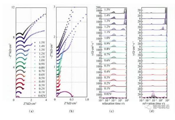 圖23石墨負極首次和第二次嵌鋰過程阻抗譜如圖(a)和(b)所示;(c)和(d)分別展示了首次和第二次鋰化過程的弛豫時間譜