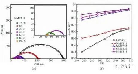 圖7鈷酸鋰和三元NMC的EIS測試結果20~100℃。(a)鈷酸鋰;(b)NMC333;(c)NMC532;(d)NMC622;(e)NMC811;(f)與溫度關聯的離子電導率