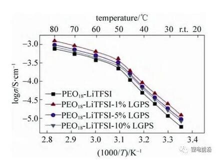 圖10展示了不同質量比復合電解質膜的變溫電導率曲線,由圖10可知,高離子導電性的無機硫化物電解質的引入提升了復合電解質的總電導率,和純PEO聚合物電解質相比,Li+遷移數也獲得進一步的提升。