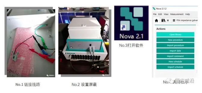 工步1:按圖3(步驟1)所示連接測試線,紅-紅-紅,黑-黑-藍,綠-綠;將試樣按正負極夾好,陶瓷片不區分正負極;關閉屏蔽箱(步驟2),依次打開工作站和放大器電源,打開Nova 2.1軟件。單擊Open library選項后,選擇FRA impedance potentiostatic選項卡。