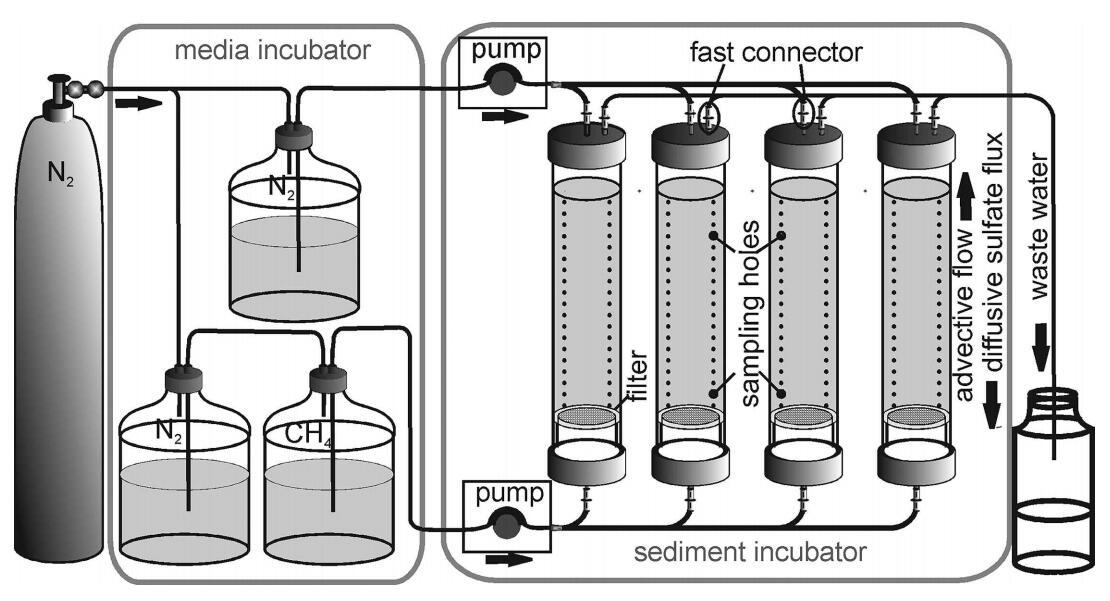 Girguis等人(2003、2005)開發了一種連續流厭氧甲烷培養系統(AMIS),以測定ANME的生長速率。AMIS使用完整的沉積物巖心,從底部輸送富含甲烷的海水(包括硫酸鹽),從頂部輸送不含甲烷的海水(包括硫酸鹽)。在反應器中制備海水,以確保在大氣壓下甲烷濃度恒定。