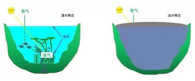 當(dāng)湖泊水體中氮磷營(yíng)養(yǎng)物質(zhì)過(guò)剩時(shí),水體中浮游藻類會(huì)暴發(fā)性生長(zhǎng),覆蓋水體表層,導(dǎo)致水體透明度降低,太陽(yáng)光照無(wú)法到達(dá)沉水植物表面或光照不足以維持沉水植物的光合作用過(guò)程,從而導(dǎo)致沉水植物的衰退甚至逐漸消亡,沉水植物的缺失會(huì)加劇湖泊水質(zhì)的惡化,使湖泊生態(tài)系統(tǒng)由清水穩(wěn)態(tài)向濁水穩(wěn)態(tài)轉(zhuǎn)化。(圖2)