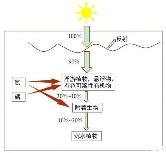 太陽(yáng)輻射進(jìn)入水體后會(huì)受到水體本身的吸收,浮游植物、懸浮物的吸收散射以及有色可溶性有機(jī)物的吸收,然后到達(dá)生長(zhǎng)在水面以下的沉水植物葉片表面,這一過(guò)程稱為光衰減(圖3)。