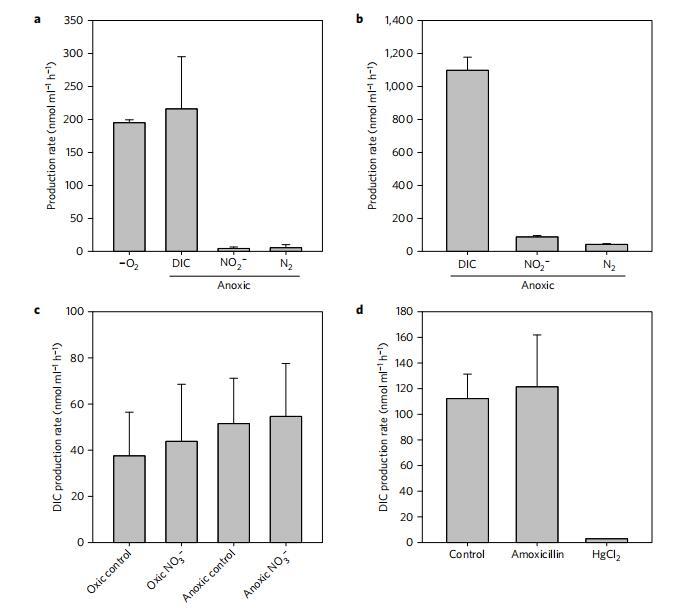 圖1|FTR實驗中測量的代謝。從澳大利亞菲利浦港灣(a、c、d)和丹麥科特明德(b)收集的沉積物。a、b、氧氣消耗量、DIC、亞硝酸鹽和二氮(as N)的產(chǎn)生量在測量氧氣消耗量后,在實驗中切換為缺氧狀態(tài),N=4。c、在有氧和缺氧條件下,以及在硝酸鹽存在和不存在的情況下,DIC生成率,每個處理n=3。d、缺氧條件下的DIC生成:對照組(n=2),在50 mg l?1阿莫西林(n=2)和2 mmol?1 HgCl2(n=1)。所有誤差條均為一個標(biāo)準(zhǔn)偏差