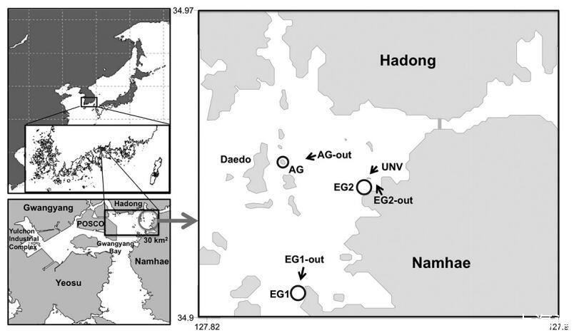 光洋灣是一個淺層半封閉系統,位于朝鮮半島南部海岸,其水文受通過狹窄海峽(約4 km寬)與近海水域交換的控制(圖1)。該灣的最大潮差約為4 m。淺海岸地區(水深小于10 m)占整個光洋灣地區的50%以上,主要由淤泥和粘土組成的沉積物構成。盡管位于海灣西南角的哈東燃煤電廠和Yulchon工業綜合體也是碳、養分和污染物的潛在來源,但陸地外來碳和養分的主要來源還是來自Sumjin河(圖1)。光陽灣的自養群落由浮游植物、微型底棲生物、鰻草(Zostera marina L.)和幾種大型藻類組成,所有這些藻類在整個海灣中分布不均勻(Kim等人,1998年,Kim和Choi,2004年)。