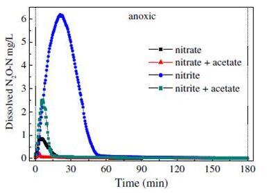 圖1、、不同條件下的N2O的產(chǎn)生特征,只添加醋酸鹽鹽,同吋添加酸鹽和乙酸鈉,只添加亞硝酸鹽、同時(shí)添加亞銷(xiāo)酸和乙酸鈉。圖中可以看出,當(dāng)系統(tǒng)中不添加外碳源乙酸,DPAOs以厭氧段合成的胞內(nèi)聚合物PHA為碳源進(jìn)行反硝化,反應(yīng)過(guò)程中有相應(yīng)的N2O產(chǎn)生,但是其最高累積量達(dá)0.85mg/L。而系統(tǒng)中添加外碳源乙酸時(shí),首先利用乙酸鈉為碳源進(jìn)行反硝化,其最高累積量?jī)H有0.21mg/L,遠(yuǎn)低于沒(méi)有外加碳源添加時(shí)的N2O產(chǎn)生量。這也是說(shuō)明當(dāng)以為碳源進(jìn)行反硝化時(shí)將會(huì)導(dǎo)致的N2O產(chǎn)生量增加。相比外碳源乙酸鈉,PHA為慢速生物降解物質(zhì),當(dāng)被用于反硝化碳源時(shí),其單位時(shí)間內(nèi)提供的電子不能滿(mǎn)足反硝化的需求,導(dǎo)致反硝化過(guò)程中各種酶對(duì)電子形成競(jìng)爭(zhēng)。由于N2O的還原處于反硝化反應(yīng)鏈的末端,導(dǎo)致相比別的還原酶,氧化亞氮還原酶對(duì)電子的競(jìng)爭(zhēng)能力弱,獲得的電子不足以使N2O完全還原,從而誘發(fā)了N2O積累。
