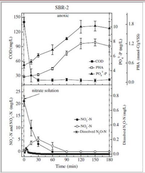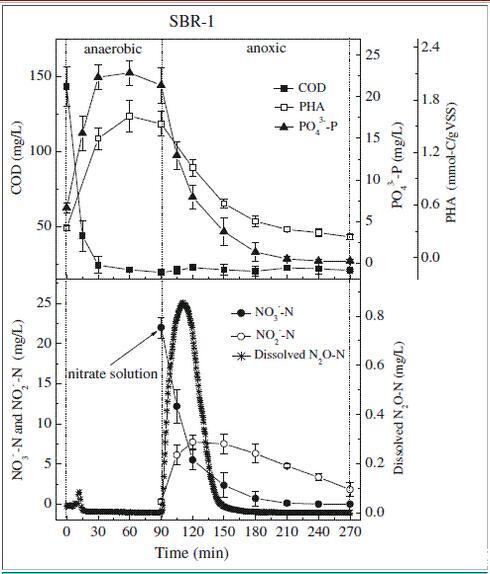 圖2、SBR-1反應(yīng)器中COD、PHA、PO43--P、NO3--N-、NO2-N以及溶解性的N2O變化趨勢(shì)。從圖中可以看出SBR主要進(jìn)行反硝化脫氮和除磷反應(yīng)。厭氧階段。COD在30分鐘內(nèi)降低到最低水平,并且伴隨著糖原的分解,PHA的合成以及PO43--P的釋放。缺氧階段主要進(jìn)行硝酸鹽的降解,以及憐酸鹽的吸收;并且伴隨著的分解和糖原的合成。而N2O的產(chǎn)生主要發(fā)生在的缺氧階段,厭氧階段兒乎沒(méi)有的產(chǎn)生;一旦KNO3溶液加入到反應(yīng)器中,溶解性的濃度迅速增加,并在缺氧反應(yīng)第15分鐘到最大值0.87mg/L,隨后溶解性的N2O濃度逐漸降低到0mg/L。