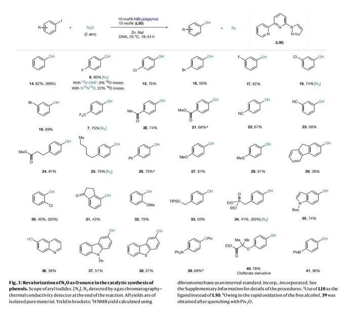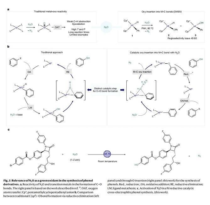 Josep Cornella教授課題組將N2O作為綠色氧源,利用有機(jī)金屬Ni配合物活化N2O,在溫和條件下成功地將一系列芳基鹵化物高選擇性地轉(zhuǎn)化為高價值的酚類化合物。這種獨(dú)特的有機(jī)金屬C-O鍵形成不同于當(dāng)前基于還原消除的策略,并為芳基鹵化物轉(zhuǎn)化為酚類化合物提供了新方法和新借鑒。