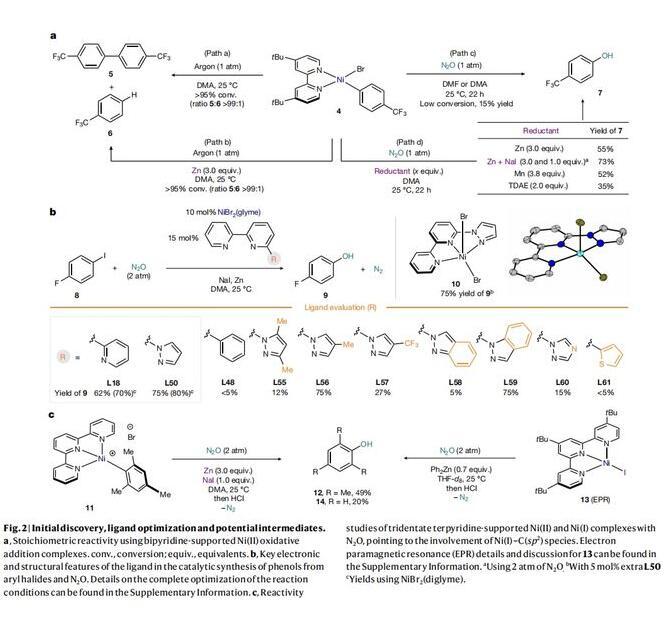 根據(jù)前人的研究成果:N2O可以與某些膦-Ni(II)配合物反應(yīng)(Organometallics1995,14,456-460;J.Am.Chem.Soc.1993,115,2075–2077.)。作者合成了氧化加成產(chǎn)物4,并研究了其與N2O的反應(yīng)性(Fig.2a)。結(jié)果表明:在氬氣氛圍下溶解于DMA中,4發(fā)生分解主要生成自偶聯(lián)產(chǎn)物5以及痕量的脫鹵產(chǎn)物6(path a),在Zn等還原劑的存在下,會加速4的分解(path b)。將氬氣換成N2O時,4的溶液的亮紅色仍然存在,表明分解速率變慢。經(jīng)過酸處理后,酚7的產(chǎn)率為15%(path c)。在此基礎(chǔ)之上,向反應(yīng)體系里添加Zn做還原劑,可提高7的產(chǎn)率,尤其是添加Zn和NaI的組合時,7的產(chǎn)率可提高至73%(path d)。隨后作者對配體進(jìn)行了篩選發(fā)現(xiàn)聯(lián)吡啶2-位取代的三齒氮化配體對催化活性至關(guān)重要,其中三聯(lián)吡啶(L18)和6-吡唑基-2,2'-聯(lián)吡啶(L50)效果最好(Fig.2b)。用C-H或S取代N原子會抑制催化活性(L48和L61);吡唑單元的N旁邊的空間位阻也會抑制催化活性(L55和L58);吡唑上的缺電子取代基會顯著降低酚的產(chǎn)率。為了證明反應(yīng)中的Ni-ligand的參與,作者制備了配合物10并對其進(jìn)行了結(jié)構(gòu)表征,使用10作為催化劑,得到酚9(75%),因此證實(shí)預(yù)配合物具有催化能力。然而,盡管鄰位中存在兩個Me基團(tuán),但在Zn和NaI存在下,反應(yīng)后用酸性處理后以49%的產(chǎn)率提供了所需的mesitol(12)。為了進(jìn)一步證明Ni(I)-C(sp2)參與反應(yīng),作者將(tBu-terpy)Ni(I)-I(13)與Ph2Zn在N2O下進(jìn)行了反應(yīng),觀察到20%的酚(14)的生成。這些發(fā)現(xiàn)表明,Ni(II)物種被還原為Ni(I),以及碘鹽對C(sp2)-O的形成鍵非常重要。