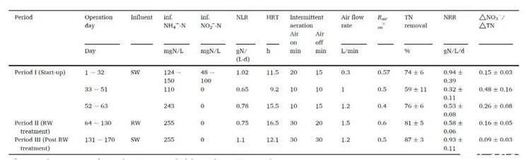 在第二階段(處理RW),進(jìn)水從SW變?yōu)門HP-AD廢水。進(jìn)水COD濃度為547±16 mgCOD/L,COD/NH4+-N比率為2.2±0.1。出水COD濃度為484±52 mgCOD/L,COD去除率約為12%。COD去除率相對低于以往研究(兩階段PN/A系統(tǒng)實(shí)現(xiàn)了50.4%到80%的高COD去除率,而PN反應(yīng)器去除了53%到66%的COD。可能的解釋可能為:(1)與之前的兩階段PN/A系統(tǒng)的PN反應(yīng)器(0.8~2 mgDO/L)相比,本研究中的DO(<0.05 mg/L)較低,好氧階段的氧氣限制導(dǎo)致COD氧化效果較差。(2)與之前的研究相比,THP-AD廢水中有機(jī)物的生物降解性較低。有機(jī)物的可生物降解性高度決定了于厭氧消化效率和穩(wěn)定性,因此不同污水源的有機(jī)物特性不同是合理的。從第74天到第101天,出水NO2-濃度保持相對較低。同時,出水NO3-顯著減少,導(dǎo)致ΔNO3-/ΔTN比I期低0.16。RW處理期間,體系實(shí)現(xiàn)了令人滿意的NRR(0.58±0.06 gN/(L·d)),與之前實(shí)驗(yàn)室規(guī)模和中試規(guī)模的研究相當(dāng)。