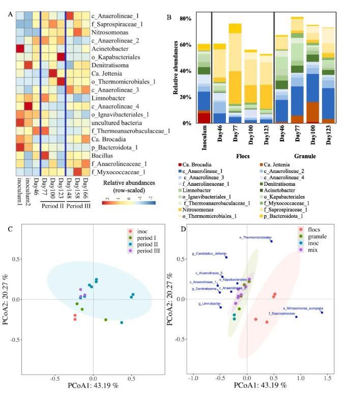通過PCoA分析進(jìn)一步評估了反應(yīng)器運(yùn)行過程中微生物群落組成的演變。結(jié)果顯示來自相同運(yùn)行時期的污泥樣品之間沒有存在明顯的聚類(圖4,C)。相比之下,基于污泥粒徑的樣品有明顯的分離(圖4,D)。絮狀污泥與顆粒污泥和混合污泥在PCoA 1方向上明顯分離(43.2%解釋度),Nitrosomonas europaea和f_Saprospiraceae對PCoA 1軸的貢獻(xiàn)最大。來自顆粒污泥和混合污泥的樣品沿PCoA 1軸緊密聚集(圖4,D)并沿PCoA 2軸分離。Ca.Jettenia和Thermomicrobiales主要貢獻(xiàn)于PCoA 2軸。這些結(jié)果表明,與絮狀污泥相比,顆粒污泥與混合污泥具有更多的相似性。