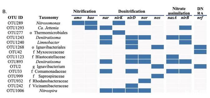 圖5 PICRUSt 2預(yù)測的微生物群落功能。A:參與氮轉(zhuǎn)化的基因。B:基于PICRUSt預(yù)測的由高豐度OTU編碼的氮轉(zhuǎn)化基因。藍(lán)色表示OTUs編碼了相應(yīng)的基因,淺灰色表示OTUs沒有編碼相應(yīng)基因。