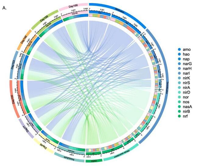 研究檢測了40個最豐富的OTU的氮轉(zhuǎn)化能力,其中15個OTU編碼氮轉(zhuǎn)化基因(圖5,B)。Nitrosomonas-AOB編碼amo和hao,顯示完整的NH4+到NO2-途徑。Ca.Jettenia-AnAOB編碼hao和nar。許多編碼nar的OTU,隸屬于Denitratisoma、Limnobacter和f_Commonadaceae,表明它們具有將硝酸鹽還原為亞硝酸鹽的能力。值得注意的是,Denitratisoma編碼nar、nirD和nor,能夠?qū)O3-還原為N2O,這意味著Denitratisoma spp.是N2O生產(chǎn)者,這在之前的研究中也有記載,表明Denitratisoma oestradiolicum可能有助于厭氧氨氧化反應(yīng)器中的N2O生產(chǎn)。注釋為o_Thermomicrobiales_1的高度豐富OTU編碼了nirK,它也可能是N2O生產(chǎn)者。同時,o_Ignavibacteriales、g_Ignavibacterium和f_Saprospiraceae編碼nos,可能將N2O還原為N2。值得注意的是,根據(jù)PICRUTs 2的基因功能預(yù)測,豐富的異養(yǎng)細(xì)菌Anaerolineae沒有編碼任何氮轉(zhuǎn)化基因。相反,之前的一項研究基于宏基因組學(xué)方法發(fā)現(xiàn)厭氧氨氧化顆粒污泥(本研究接種物)中的Anaerolineae編碼包括nar和nir的反硝化基因。與此相同,許多研究報告稱,Anaerolineae編碼反硝化基因并可以進(jìn)行DNRA過程。因此可見,基于16S rRNA擴(kuò)增子測序的功能預(yù)測可能不完整,導(dǎo)致Anaerolineae spp.的氮轉(zhuǎn)化基因在預(yù)測中缺失。