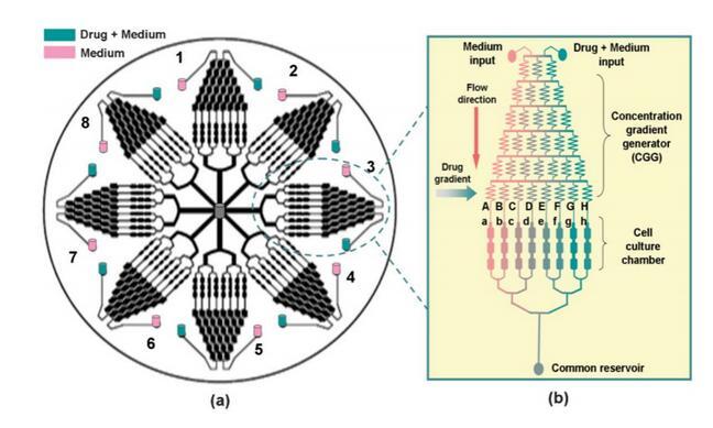在細(xì)胞水平的藥物篩選上,微流控芯片技術(shù)也獨(dú)占優(yōu)勢(shì)。有研究者構(gòu)建了一套用于細(xì)胞水平藥物篩選研究的集成化微流控芯片系統(tǒng),芯片結(jié)構(gòu)的主體部分是由8個(gè)金字塔形的濃度梯度生成器網(wǎng)絡(luò)結(jié)構(gòu)圍繞一個(gè)公共的廢液池構(gòu)成,該結(jié)構(gòu)單次可產(chǎn)生64種藥物作用條件,并獲得192種細(xì)胞生物信號(hào)(圖2),極大提高了藥物篩選的效率。