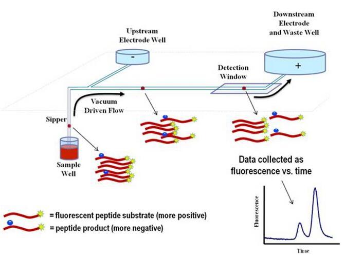 藥物分析在藥物分析領(lǐng)域,微流控芯片能降低藥物分析成本,使藥物分析檢測(cè)的手段更為豐富,也使藥物分析更加微型化和集成化,滿足藥物分析的新場景要求。一般在單一主成分藥物分析中,微流控芯片具有檢測(cè)微型化、快速化、樣品試劑消耗低等優(yōu)點(diǎn)。在更復(fù)雜的多成分藥物分析中,通常會(huì)聯(lián)合在線富集技術(shù)以進(jìn)一步提高檢測(cè)靈敏度。比如,Wu M等使用微流控芯片激光誘導(dǎo)熒光檢測(cè)器,使用場放大樣品堆積(FASS)和反向場堆積(RFS)的片上多重富集方法,同時(shí)分析卡那霉素、萬古霉素和慶大霉素的含量,這種與在線多重富集方法的聯(lián)用讓檢測(cè)靈敏度提高了近300倍,三種抗生素的檢測(cè)限可達(dá)0.20~0.80μg/L。實(shí)際上,微流控分析還在手性藥物毒性分析、血液尿液等藥物濃度分析、藥代動(dòng)力學(xué)分析等領(lǐng)域具有巨大應(yīng)用價(jià)值。藥物篩選微流控芯片在藥物篩選領(lǐng)域,可分為分子、細(xì)胞和整體動(dòng)物三個(gè)層次。在分子水平,美國Caliper Life Science(已被PerkinElmer收購)開發(fā)了EZ Reader生物芯片。LabChip®EZ Reader在聚丙烯微孔板中測(cè)定熒光標(biāo)記的反應(yīng)物,微流控芯片包括連接上游和下游電極的小通道,每次檢測(cè)時(shí)微量流體被“啜飲”到微孔板中。當(dāng)反應(yīng)物通過上述通道移動(dòng)時(shí),反應(yīng)組分憑借其流動(dòng)性差異被分離,其遷移率差異與被測(cè)組分的電荷/質(zhì)量比有關(guān),每個(gè)成分到達(dá)芯片上的檢測(cè)窗口時(shí),儀器會(huì)記錄一個(gè)熒光峰(圖1)。以酶學(xué)檢測(cè)為例,應(yīng)用EZ Reader芯片的實(shí)驗(yàn)底物是帶有熒光標(biāo)記的多肽,底物在反應(yīng)體系中酶的作用下轉(zhuǎn)變?yōu)楫a(chǎn)物,其所帶的電荷也發(fā)生相應(yīng)的變化,利用底物和產(chǎn)物所帶電荷的不同,將二者在芯片通道中進(jìn)行分離,達(dá)到分別檢測(cè)的目的。EZ Reader芯片的拓展應(yīng)用場景還包括激酶級(jí)聯(lián)反應(yīng)、表觀遺傳學(xué)分析、激酶的酶譜分析、核酸/蛋白結(jié)合分析等生物分子學(xué)實(shí)驗(yàn)。1661662851706320