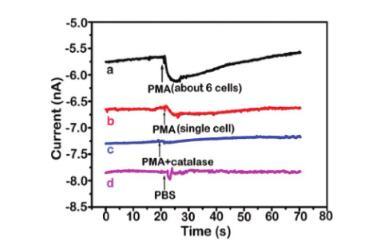 圖11金/鉑粒子混合納米結(jié)構(gòu)的微電極檢測乳腺癌細胞釋放的過氧化氫I?t曲線[13]。(a)在丙二醇甲醚醋酸酯(PMA)刺激下從6個MCF?7細胞中釋放H2O2;(b)從單個MCF?7細胞中釋放H2O2;(c)細胞與過氧化氫酶孵化之后在PMA刺激之后MCF?7細胞釋放過氧化氫;(d)在磷酸緩沖鹽溶液刺激下MCF?7細胞釋放過氧化氫