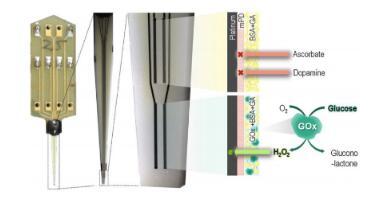 圖7包含4個鉑響應(yīng)點并覆蓋葡萄糖氧化酶的微電極陣列傳感器的示意圖[59]