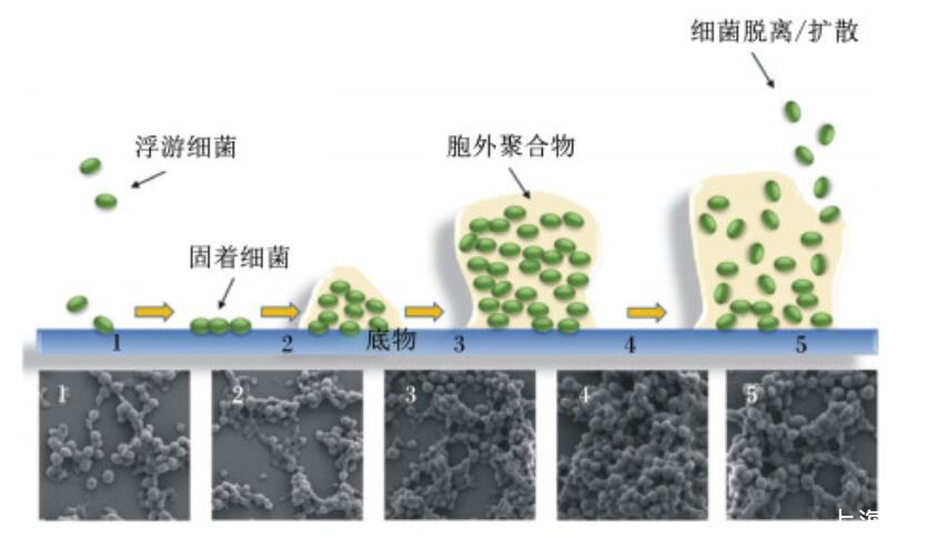 1:可逆附著reversible attachment;2:不可逆附著irreversible attachment;3:微菌落的形成micro colony;4:成熟maturation;5:細菌脫離/擴散cellular detachment。圖1豬鏈球菌生物膜形成過程示意圖和掃描電鏡圖