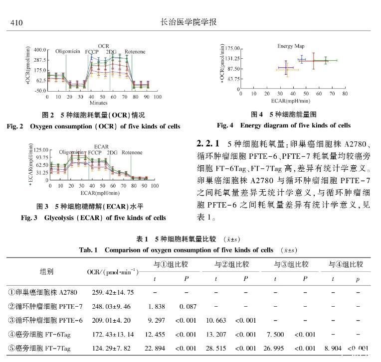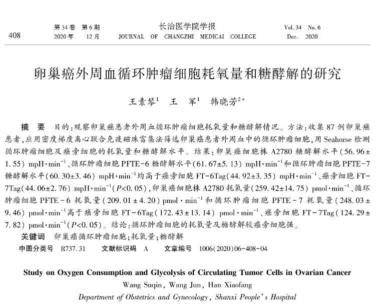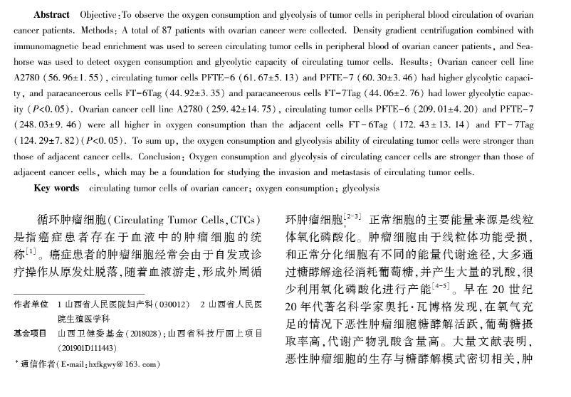 目的:觀察卵巢癌患者外周血循環(huán)腫瘤細(xì)胞耗氧量和糖酵解情況。方法:收集87例卵巢癌患者,應(yīng)用密度梯度離心聯(lián)合免疫磁珠富集法篩選卵巢癌患者外周血中的循環(huán)腫瘤細(xì)胞,用Seahorse檢測(cè)循環(huán)腫瘤細(xì)胞及癌旁細(xì)胞的耗氧量和糖酵解水平。結(jié)果:卵巢癌細(xì)胞株A2780糖酵解水平(56.96±1.55)mpH·min~(-1)、循環(huán)腫瘤細(xì)胞PFTE-6糖酵解水平(61.67±5.13)mpH·min~(-1)和循環(huán)腫瘤細(xì)胞PFTE-7糖酵解水平(60.30±3.46)mpH·min~(-1)均高于癌旁細(xì)胞FT-6Tag(44.92±3.35)mpH·min~(-1)、癌旁細(xì)胞FT-7Tag(44.06±2.76)mpH·min~(-1)(P0.05),卵巢癌細(xì)胞株A2780耗氧量(259.42±14.75)pmol·min~(-1)、循環(huán)腫瘤細(xì)胞PFTE-6耗氧量(209.01±4.20)pmol·min~(-1)和循環(huán)腫瘤細(xì)胞PFTE-7耗氧量(248.03±9.46)pmol·min~(-1)高于癌旁細(xì)胞FT-6Tag(172.43±13.14)pmol·min~(-1)、癌旁細(xì)胞FT-7Tag(124.29±7.82)pmol·min~(-1)(P0.05)。結(jié)論:循環(huán)腫瘤細(xì)胞的耗氧量及糖酵解較癌旁細(xì)胞強(qiáng)。
