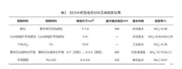 電極材料是BES的重要組成部件。電極材料在BES中可直接用作電子供體或受體,不僅會影響微生物的吸附量,也會影響微生物與電極間的電子傳遞效率。選取電極材料時,應對材料的導電性能、吸附性能、生物相容性等進行考察。近年來新型電極材料在BES脫氮中的應用情況見表2。