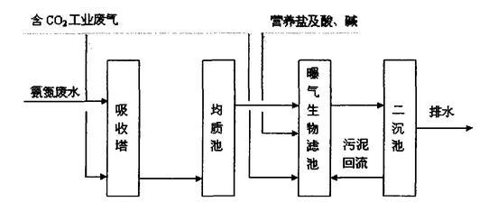 生物法處理高濃度氨氮廢水有多種形式,主要有傳統硝化反硝化、亞硝酸硝化/反硝化工藝、同時硝化/反硝化、厭氧氨氧化工藝;其中亞硝酸硝化/反硝化工藝具有占地面積小、節省投資、耗氧量小、動力消耗、碳源和堿量消耗少的優點;但此過程中仍需添加一定量的有機碳源。經進一步研究證明,在不添加有機碳源,通過生物自養也能實現亞硝酸途徑脫氮,但該法仍需添加一定的無機碳源,從而保證硝化反硝化的正常進行。而采用廢氣中二氧化碳作為無機碳源為硝化和反硝化提供營養源,是一種清潔、經濟、有效的方法。一方面可以減少二氧化碳排放量,減少排污;另一方面可以為高濃度氨氮廢水的硝化反硝化提供碳源,達到以污治污的目的。
